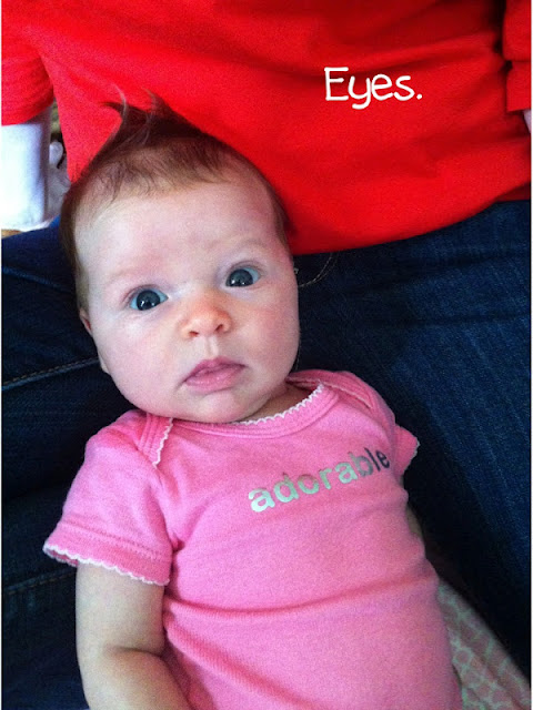 Eyes. As of right now, the babe's eyes are gray. Mine are blue, Gabe's brown. Multiple people say she has my eyes.